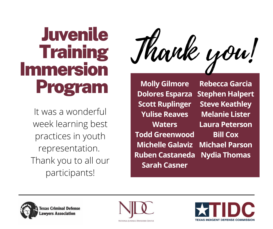 Join us in taking Texas Juvenile Defense to the next level. TCDLA has partnered with the National Juvenile Training Center and the Texas Indigent Defense Commission to bring cutting edge juvenile defense practice to Texas. During the next year we will be holding regional seminars free for juvenile law practitioners. Registration opens soon!